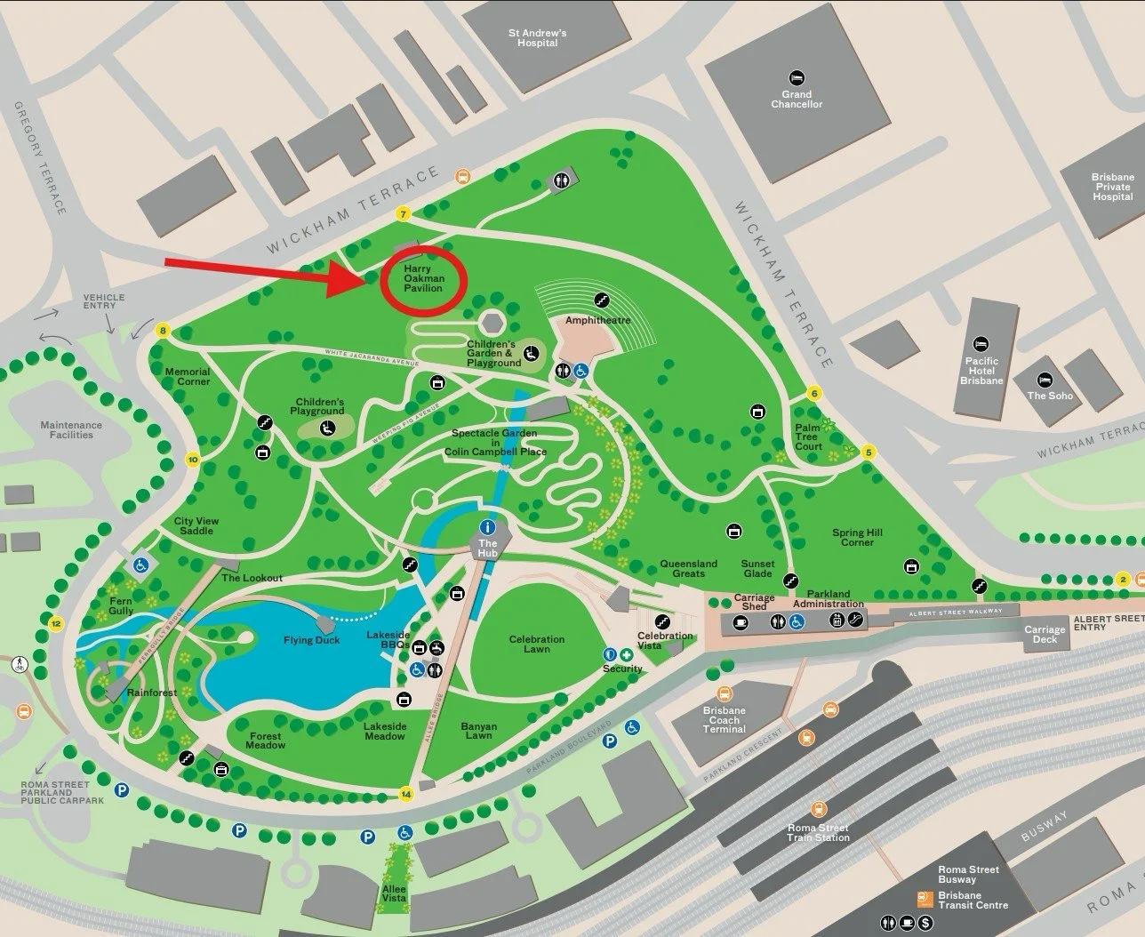 The ceremony is being held in the Roma Street Parklands, on the lawn beside the Harry Oakman Pavilion. This area is most easily accessible via Wickham Terrace, alternatively you may wish to stroll through the beautiful parklands as you make your way to the pavilion area.